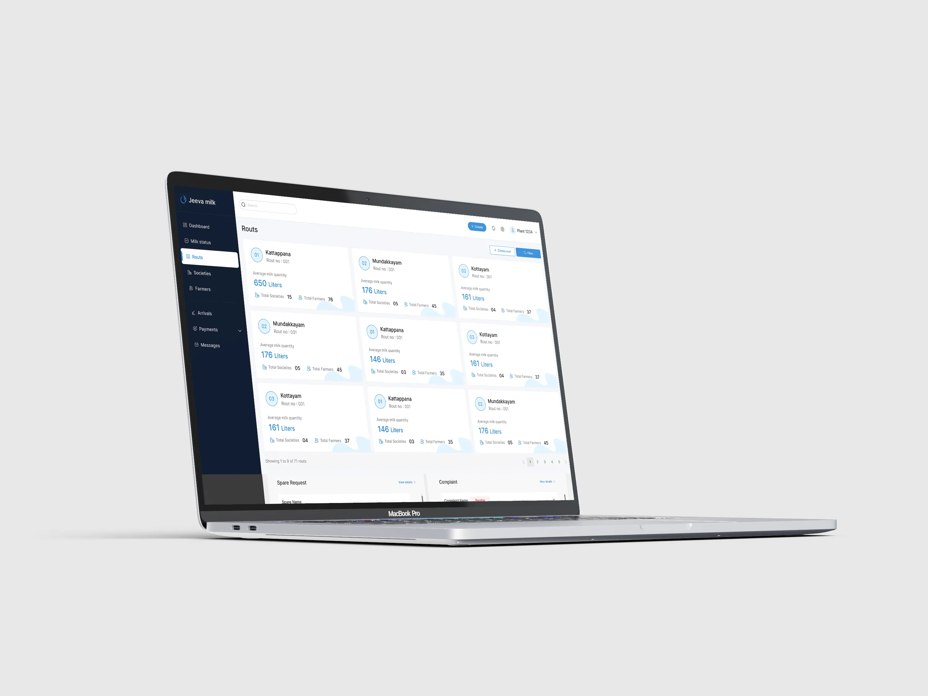 Jeeva Milk is a streamlined software solution designed to manage and monitor milk societies efficiently. The dashboard provides a clear overview of key metrics like total societies, farms, and farmers, along with real-time data on milk quantity and quality analysis. With easy navigation across modules—such as arrivals, routes, payments, and farmer data—it empowers dairy plants with data-driven insights and smooth operational control.
